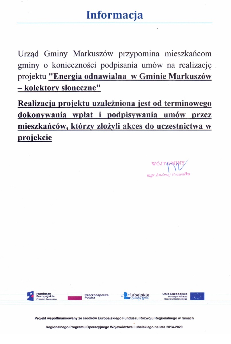 Informacja w Urzędzie Gminy Markuszów telefon 81 8818072, srodowisko@markuszow.pl