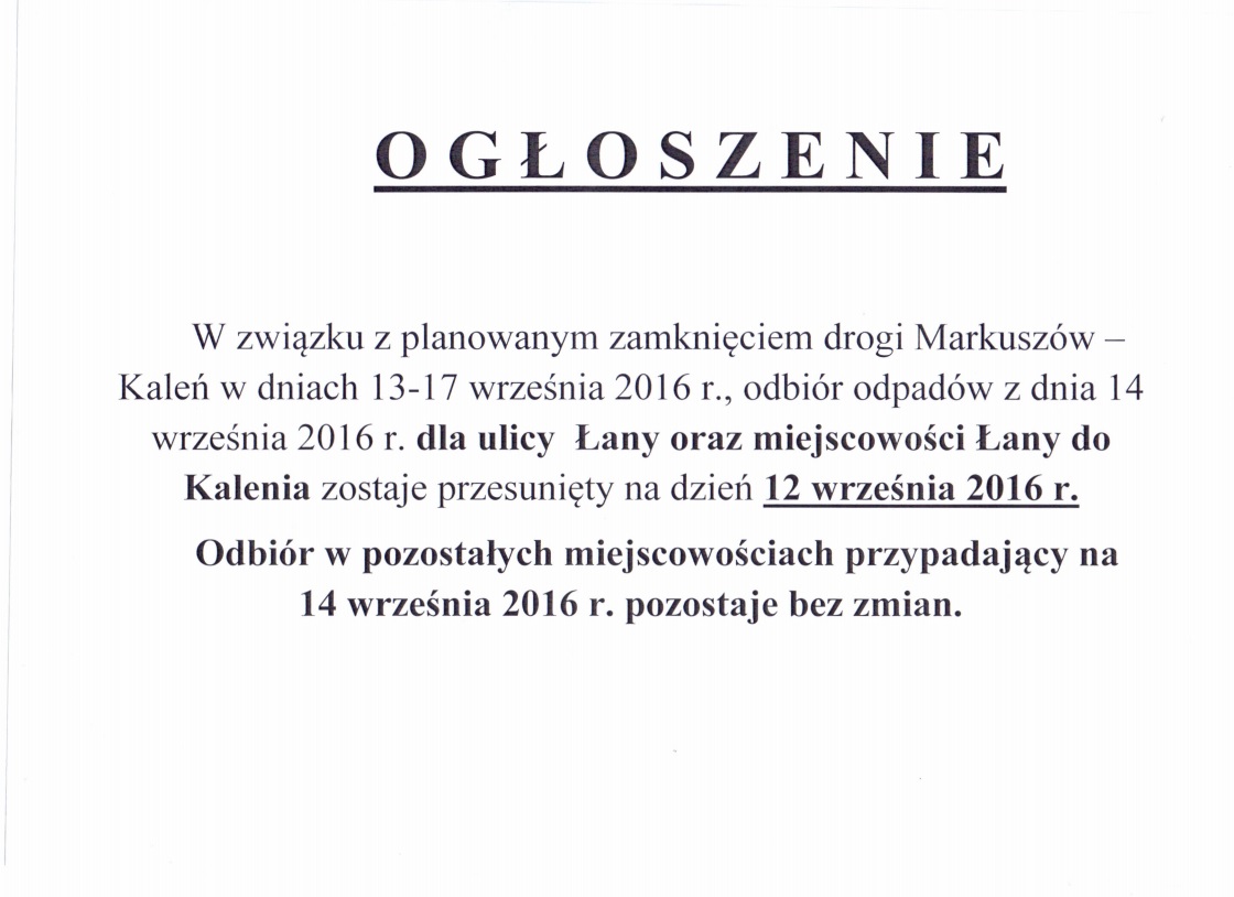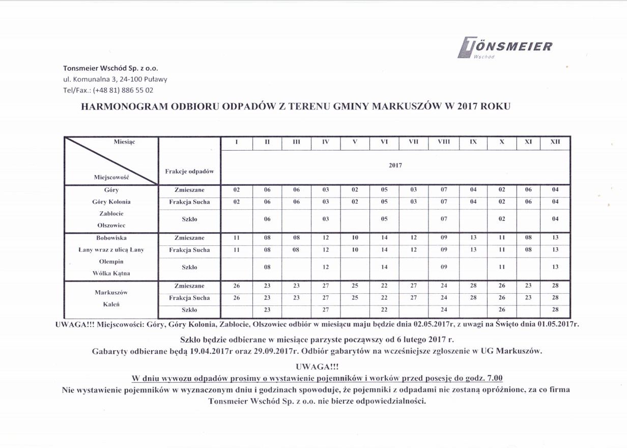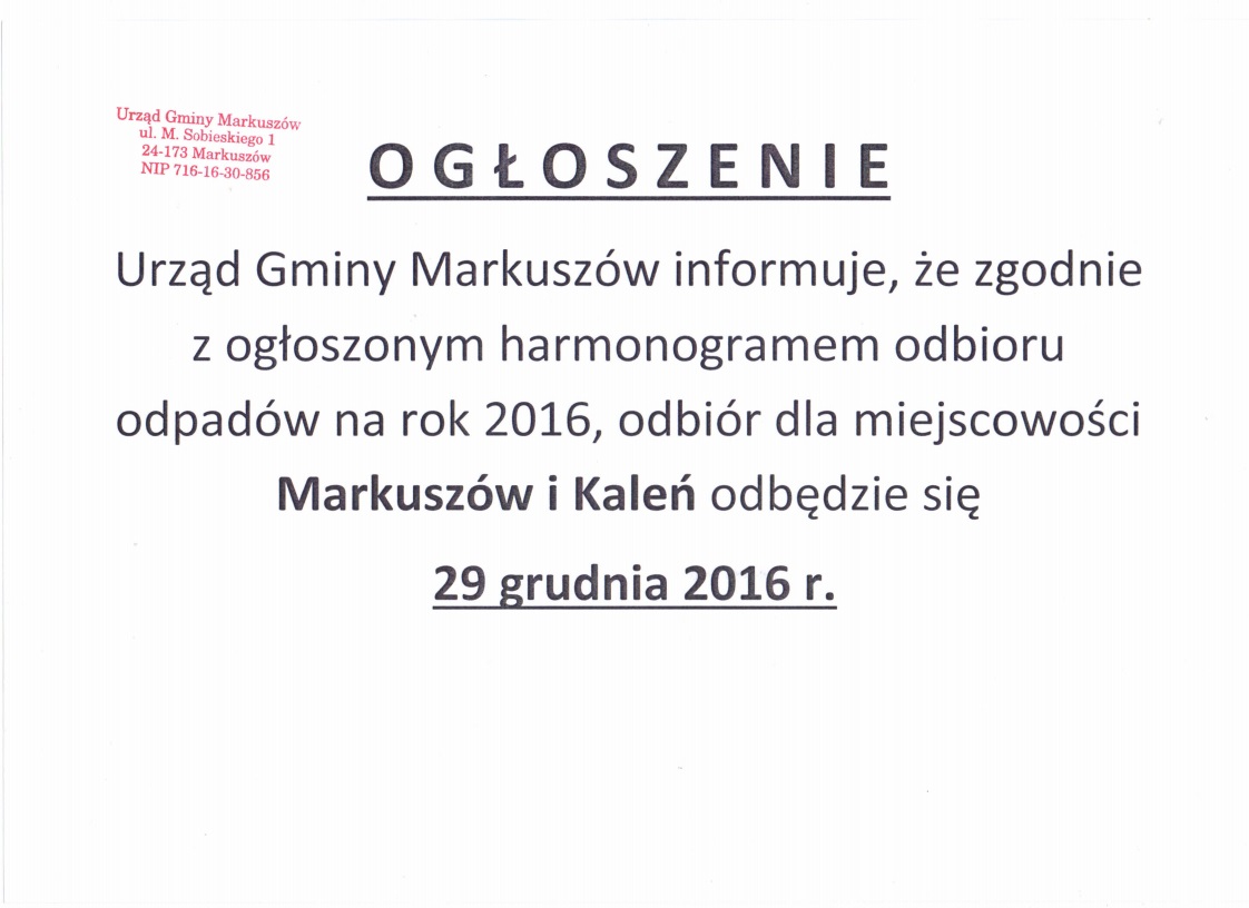 Urząd Gminy Markuszów informuje, że od 1 stycznia 2015 r. terminy odbiorów odpadów komunalnych z terenu Gminy Markuszów nie ulegają zmianie tj.
