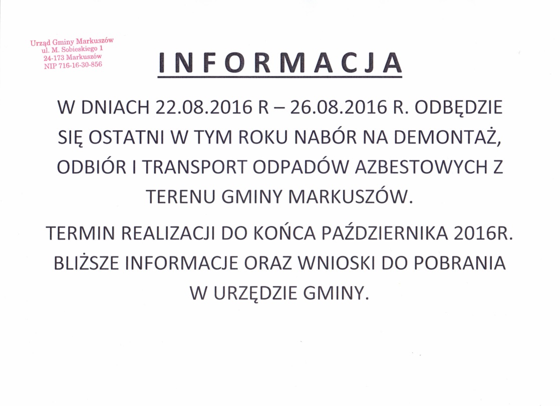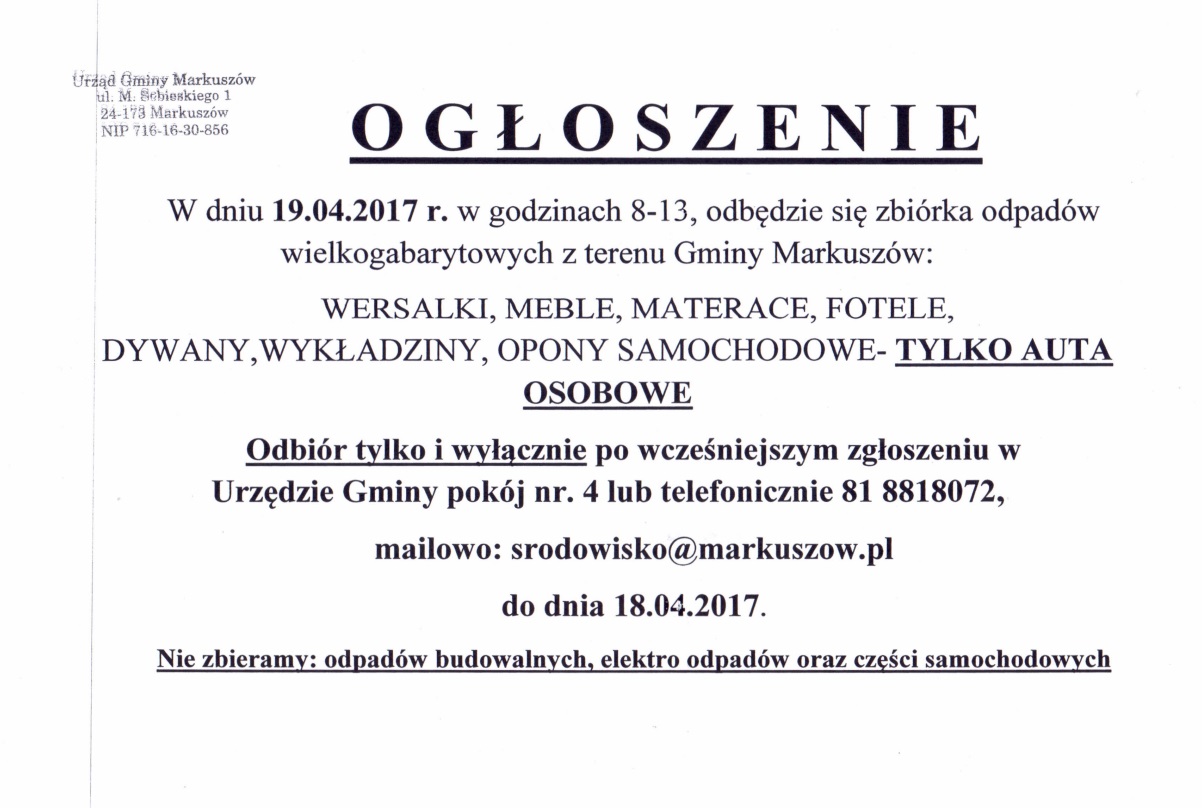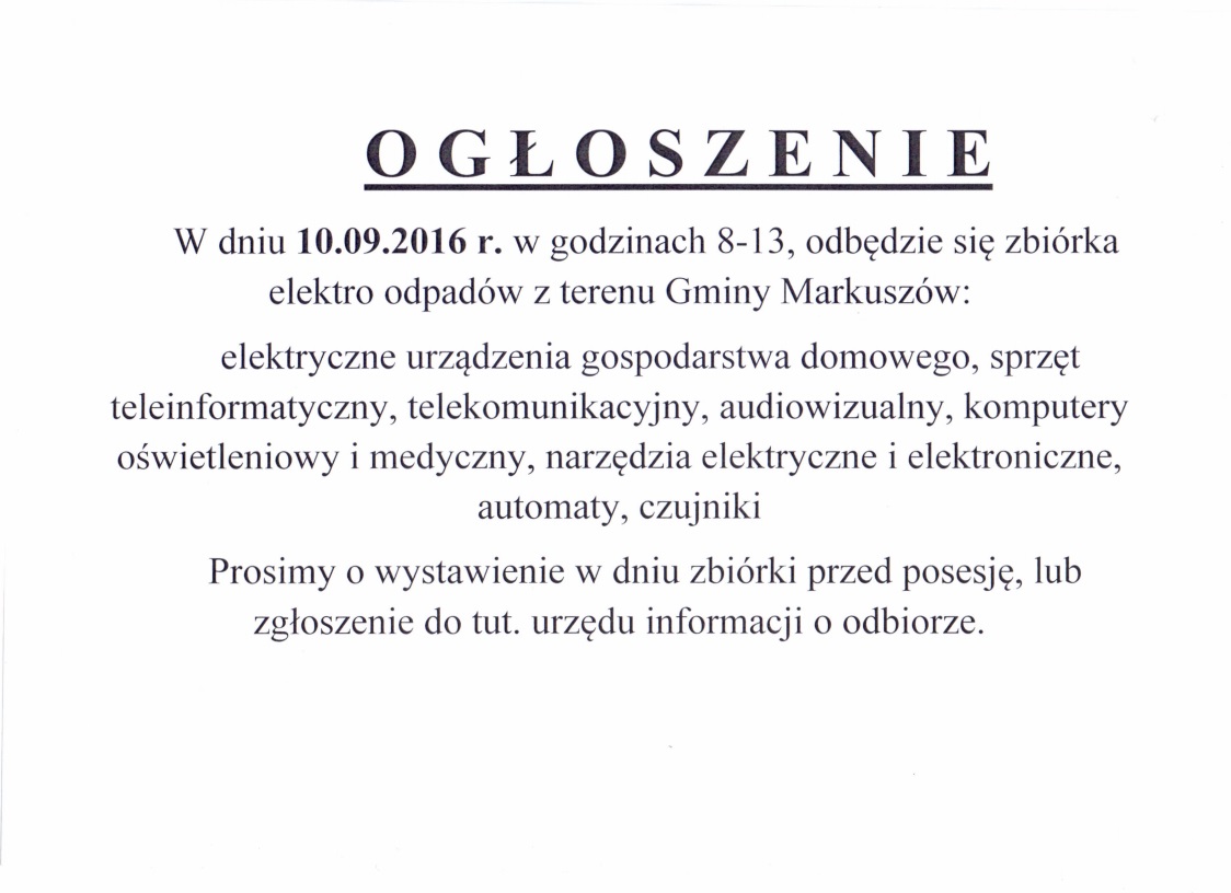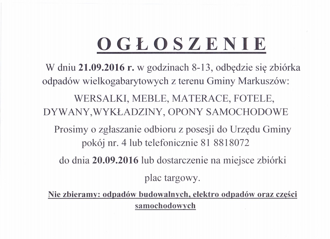 Urząd Gminy Markuszów informuje, że od 1 stycznia 2015 r. terminy odbiorów odpadów komunalnych z terenu Gminy Markuszów nie ulegają zmianie tj.