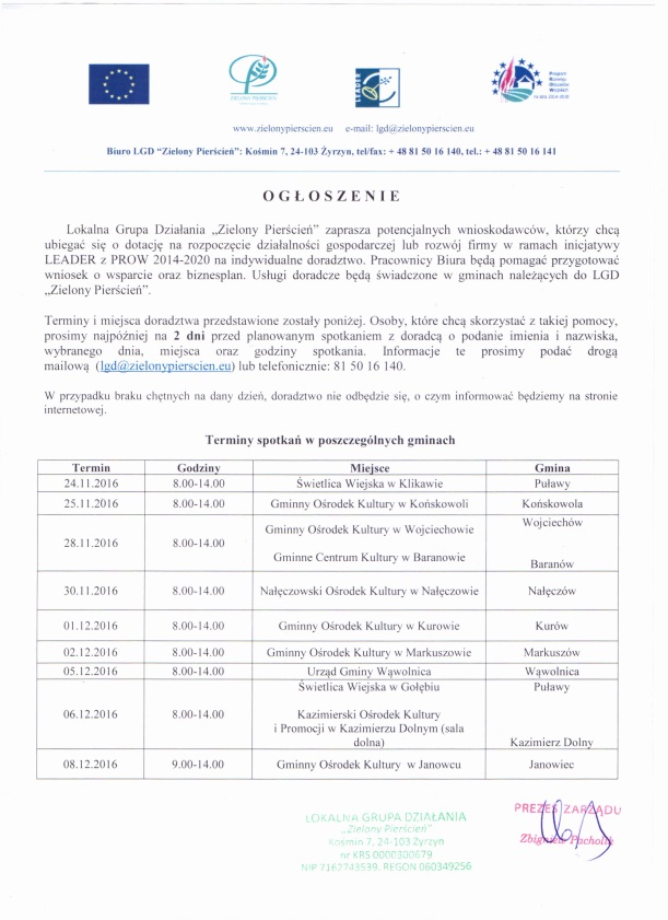 Ze względów organizacyjnych prosimy osoby zainteresowane szkoleniem o zgłaszanie się (telefonicznie: 81 50 16 140 lub mailem: lgd@zielonypierscien.eu) do Biura LGD najpóźniej 2 dni robocze przed wybranym terminem szkolenia. Prosimy o podanie wybranego terminu i miejsca szkolenia, imienia i nazwiska oraz telefon kontaktowy uczestnika.