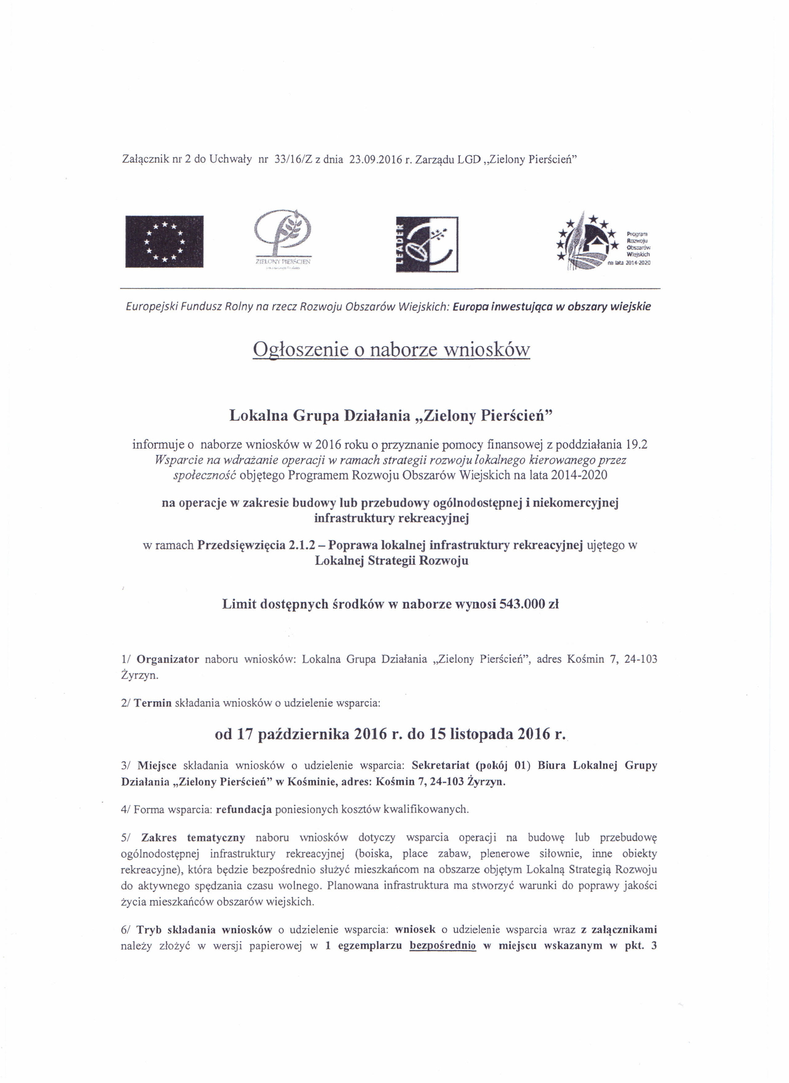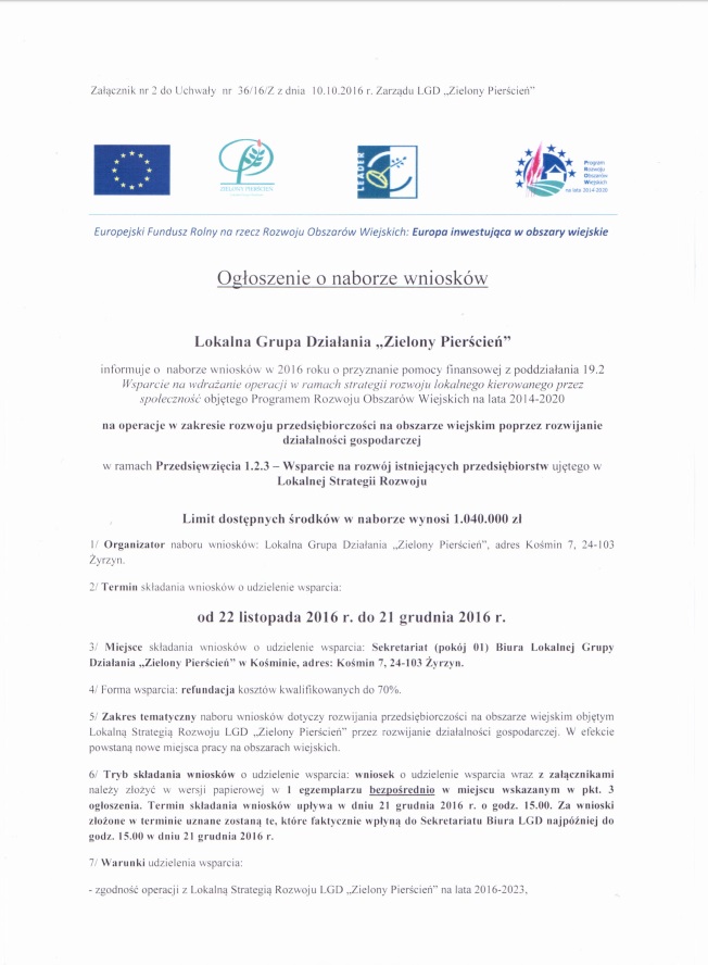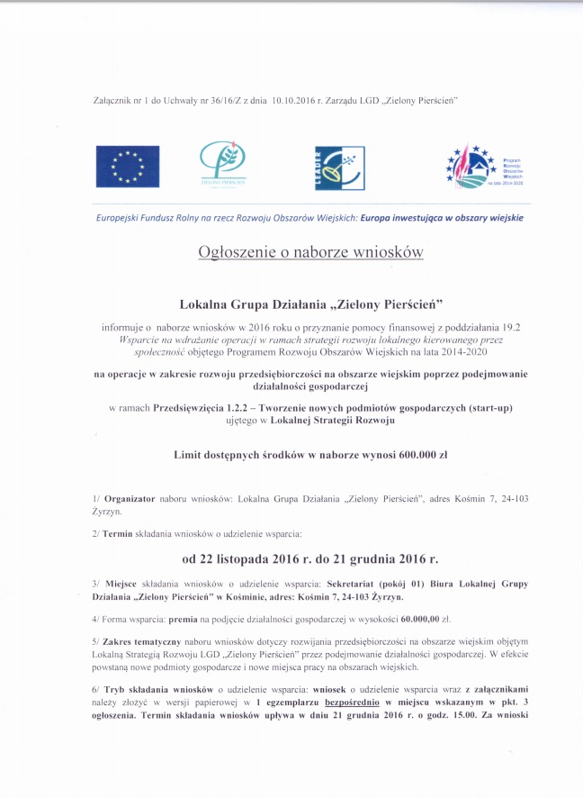 Lokalna Grupa Działania „Zielony Pierścień” uprzejmie zaprasza w dniach: 18 i 20 października 2016 r. na bezpłatne szkolenie pn. „Przygotowanie wniosku o przyznanie pomocy w zakresie rozwijania działalności gospodarczej w ramach inicjatywy LEADER z Programu Rozwoju Obszarów Wiejskich na lata 2014-2020”