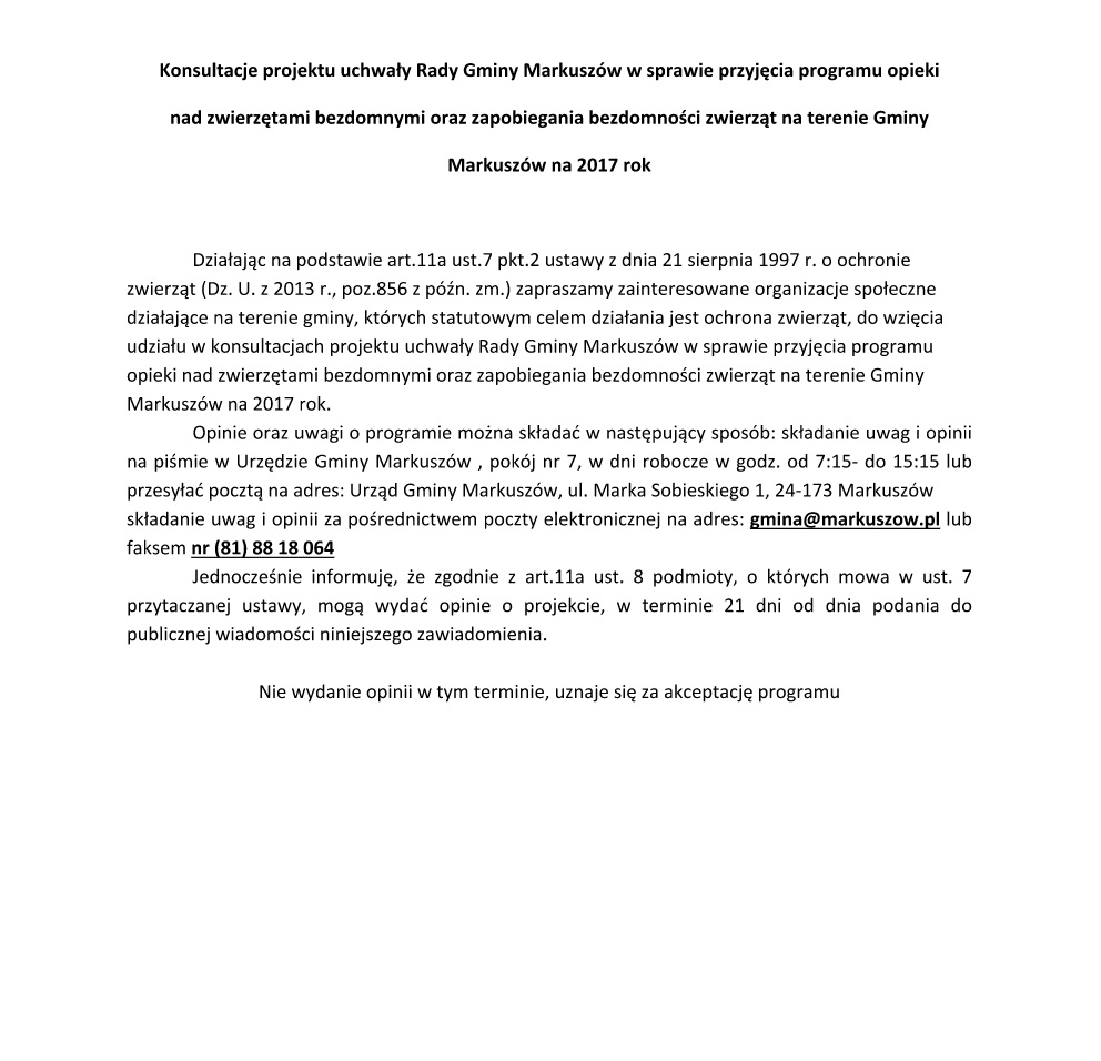 Konsultacje projektu uchwały Rady Gminy Markuszów w sprawie przyjęcia programu opieki nad zwierzętami bezdomnymi oraz zapobiegania bezdomności zwierząt na terenie Gminy Markuszów na 2015 rok