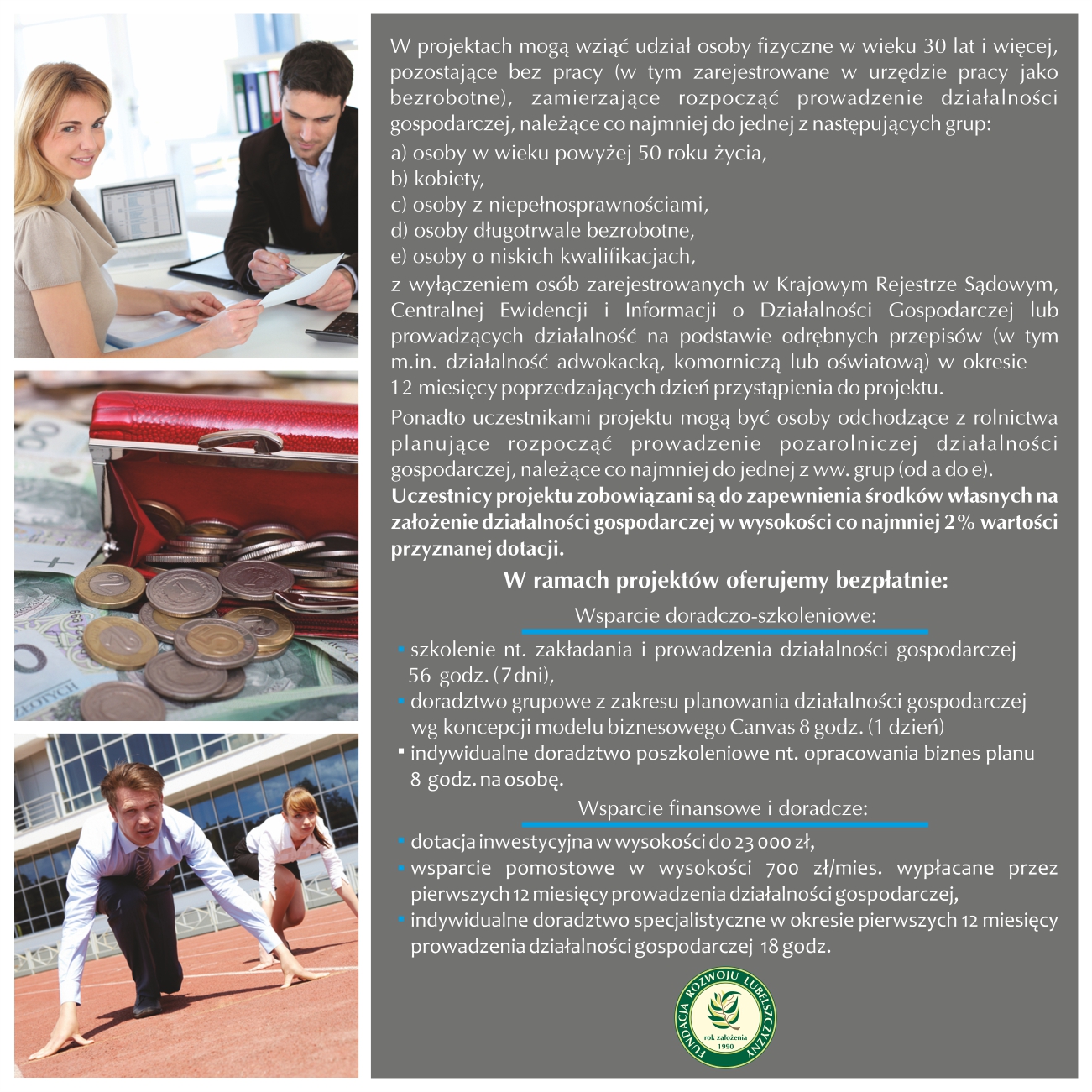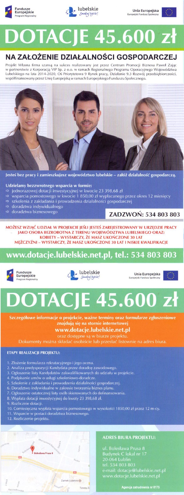 Fundacja Rozwoju Lubelszczyzny informuje, że w dniach od 17 do 28 lutego 2017 r. prowadzona będzie rekrutacja uczestników projektu „Pracuję u siebie”. Projekt zakłada udzielenie między innymi wsparcia finansowego (dotacji inwestycyjnej w kwocie 23 000 zł oraz wsparcia pomostowego w kwocie 8 400 zł) na rozpoczęcie prowadzenia pozarolniczej działalności gospodarczej.