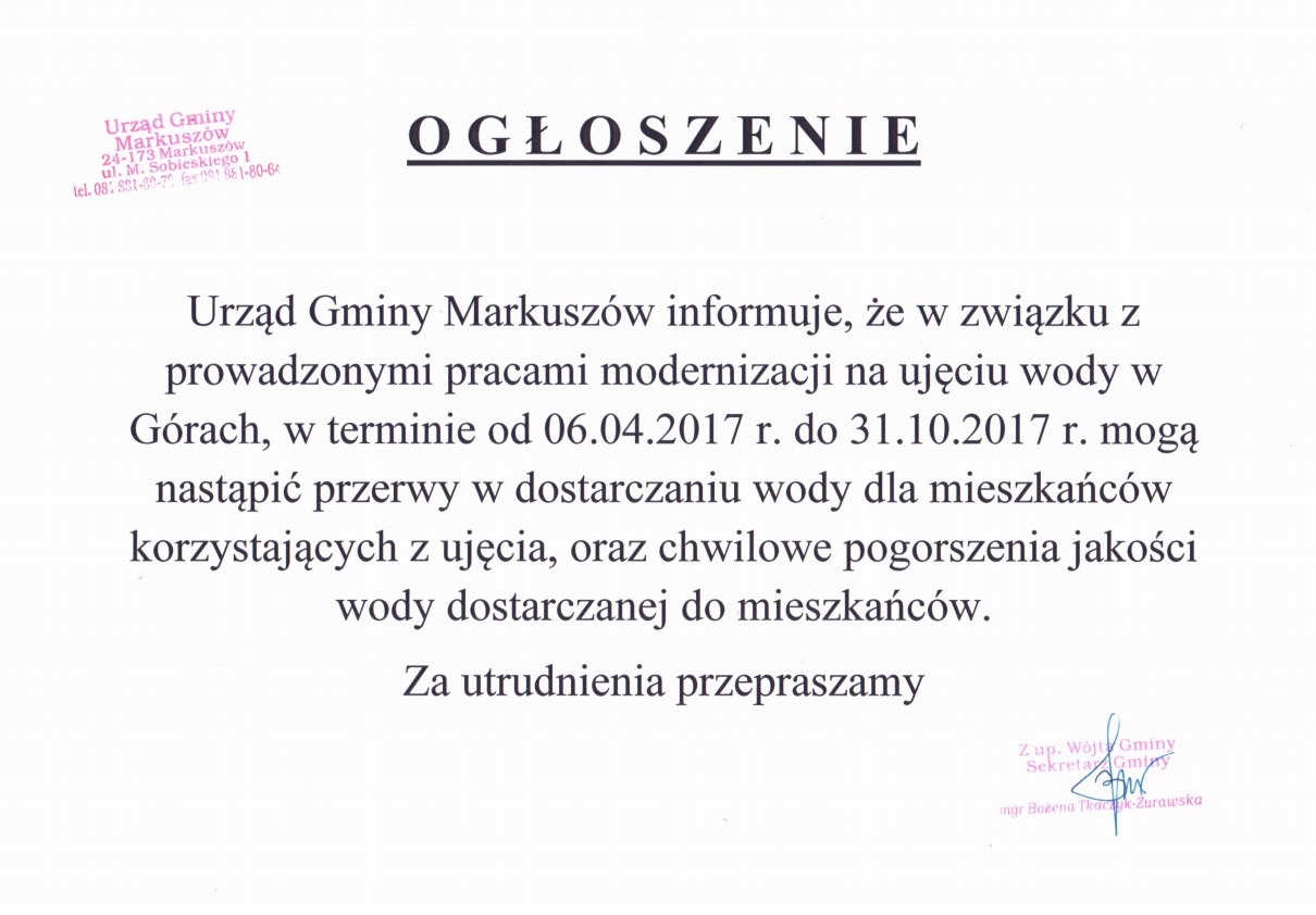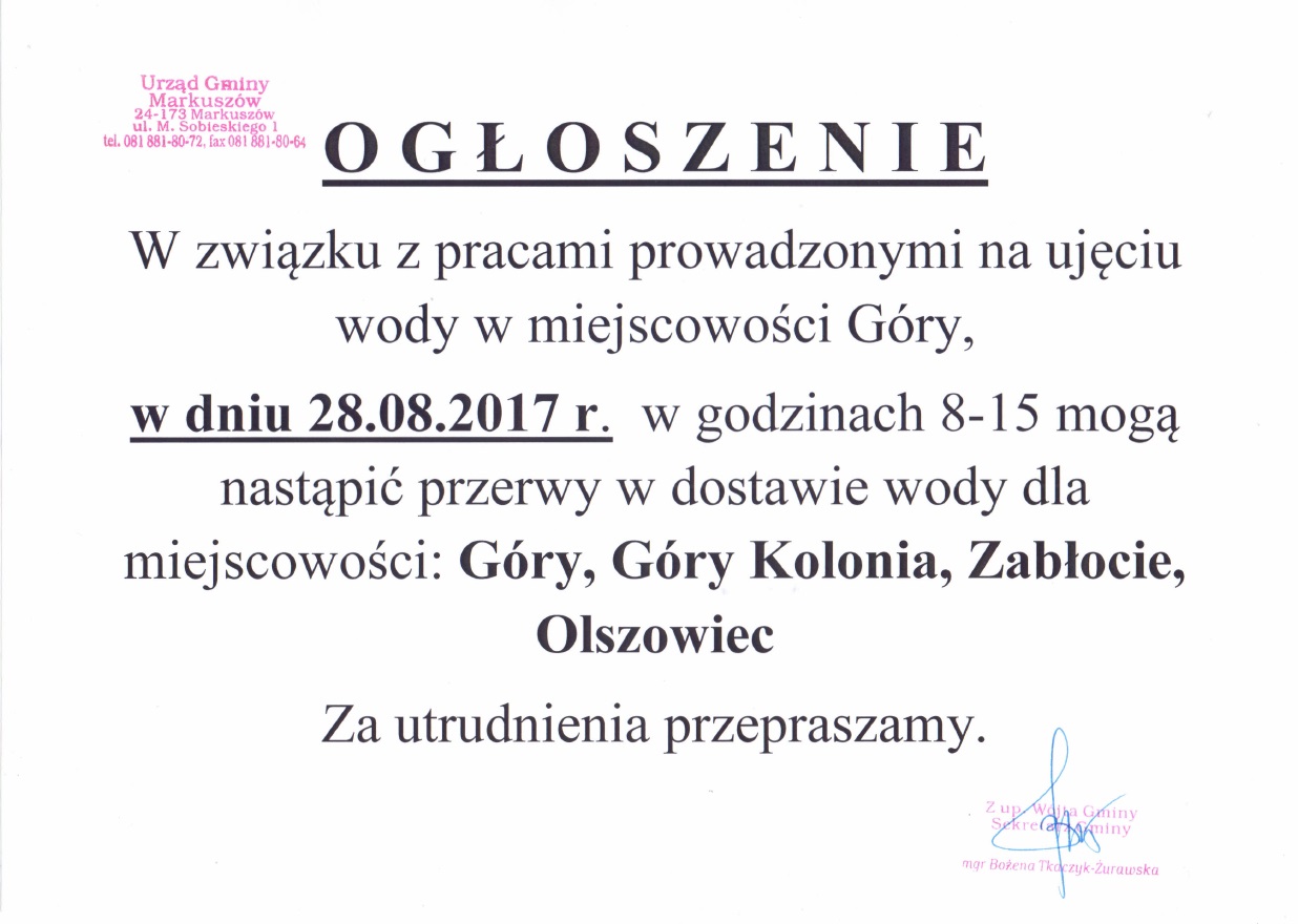 Ze względu na utrzymujące się wysokie temperatury oraz niekorzystne prognozy pogody na najbliższe dni Wójt Gminy Markuszów zwraca się z prośbą do wszystkich użytkowników korzystających z sieci wodociągowej o racjonalne korzystanie z wody.