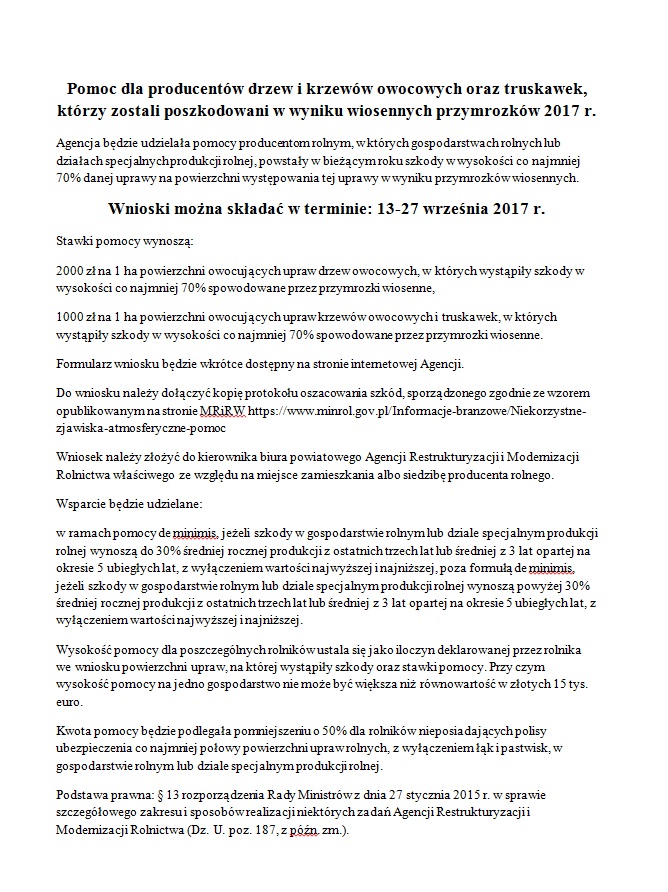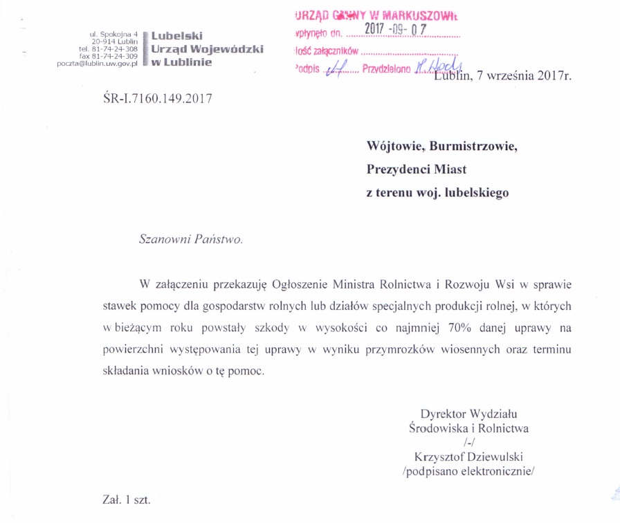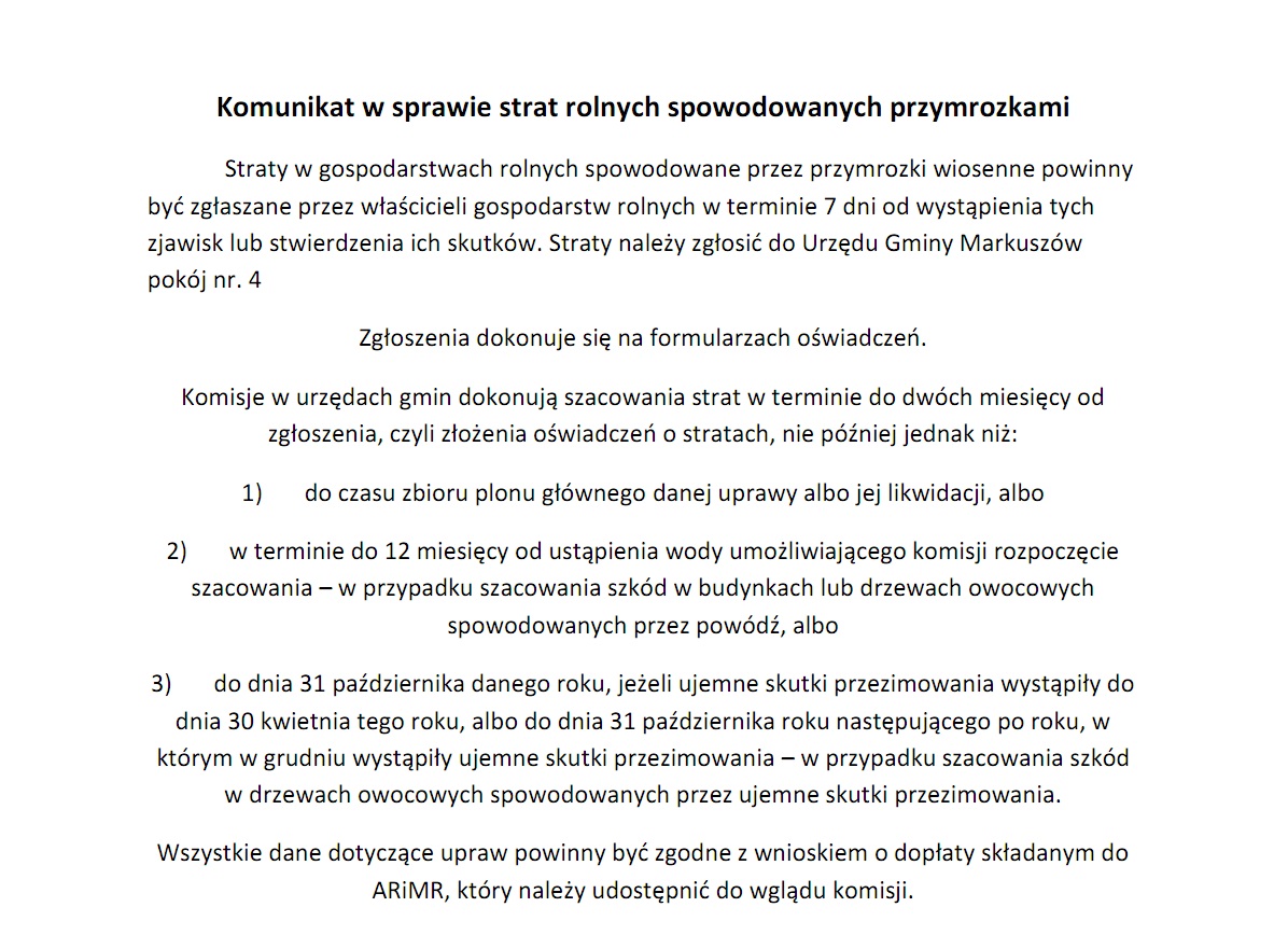 Do dnia 4 września w Urzędzie Gminy Markuszów przyjmowane są oświadczenia dotyczące strat poniesionych w wyniku suszy. W pokoju nr 4 należy pobrać odpowiednie formularze, lub przez poniższe linki do pobrania wniosków ze strony internetowej Lubelskiej Izby Rolniczej.