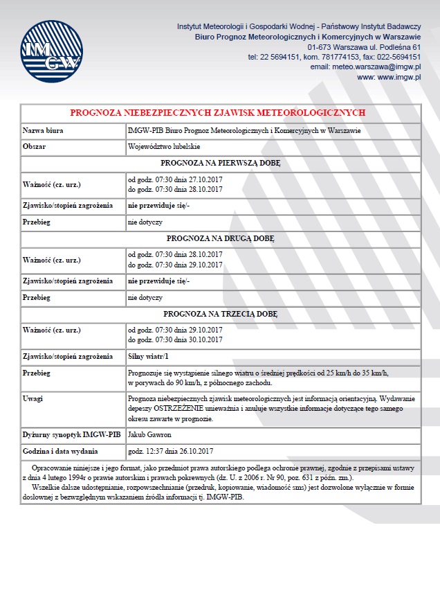 Nazwa biura: IMGW-PIB Biuro Prognoz Meteorologicznych i Komercyjnych w Warszawie